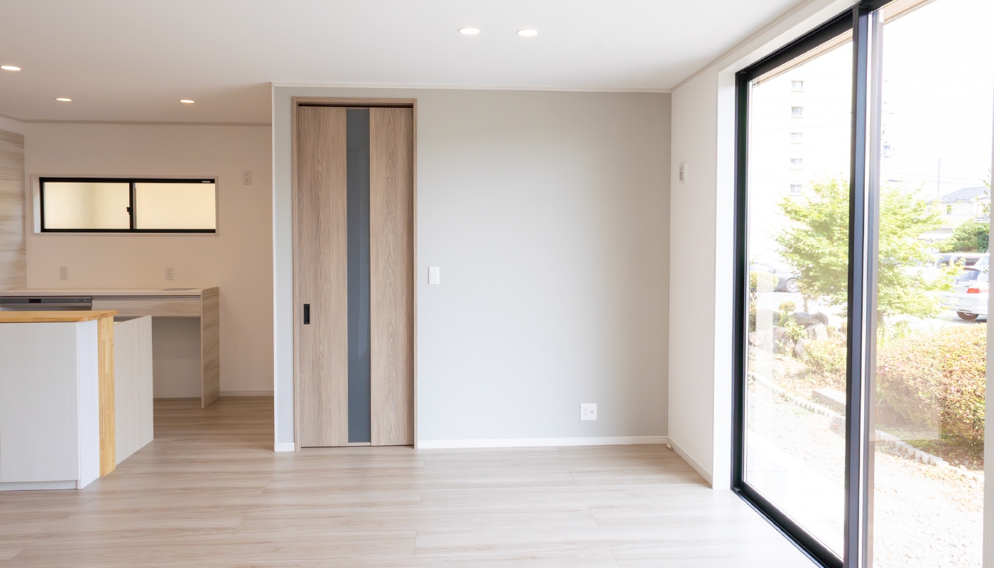 外観は白と木目のコントラストが目を惹くデザイン。太陽光パネルを設置し、機能性にもこだわりました。1階リビングは南向きに大開口の窓を配置し、自然光がたっぷり入る明るい空間に。またキッチン周り及び、各居室には大容量の収納スペースを設置しました。