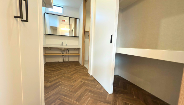 外観はジョリパッド仕上げに西側の大型ルーバーを組み合わせ、印象的なデザインに。リビングは無垢材の床とフロアコンセントで、上質さと機能性を両立。1階建具にはハイサッシ(高さ2,500mm)を採用し、開放感があります。造作洗面と脱衣室のファミリークローゼットで快適な動線を実現。寝室とリビングの間接照明が、やわらかな空間を演出します。